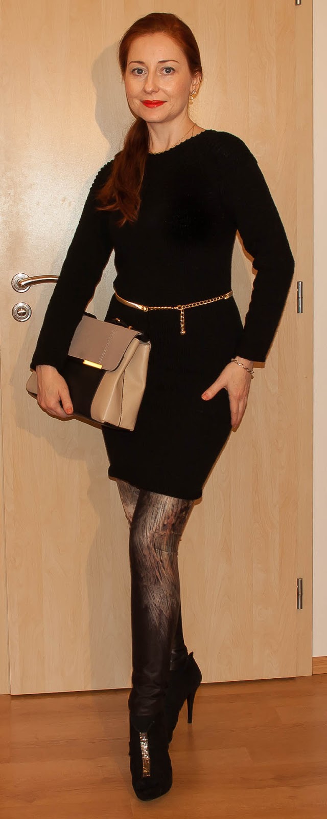 Nikol was wearing beautiful black and red dress with a bow that match her handbag with a big bow.. She looked great. I chose comfortable outfit consisting of black knitted dress and tiger boots that can be either above knees or under. Which do you like better above or under knees?